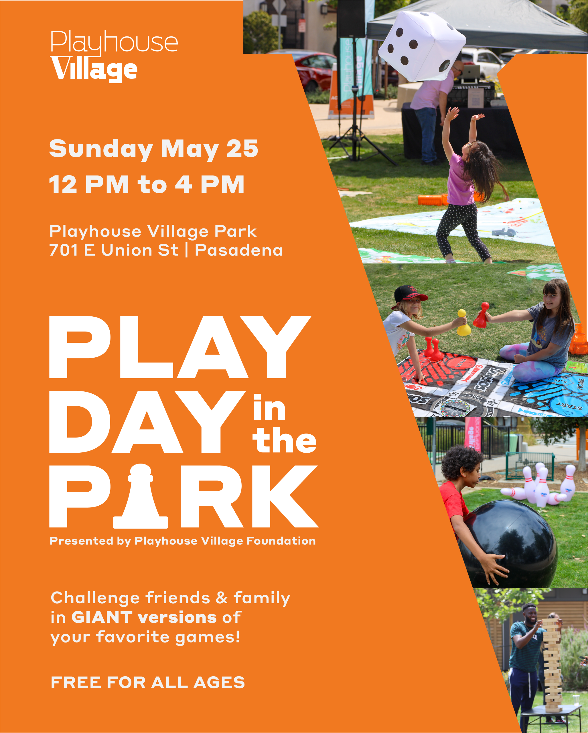 Get ready for an epic day of fun and games at PLAY DAY in the PARK presented by Playhouse Village Foundation! On Sunday, May 25th, from 12 pm to 4 pm, head over to Playhouse Village Park and challenge your friends and family to GIANT versions of your favorite games.